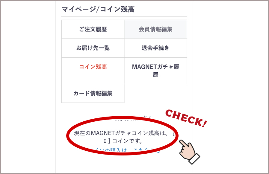 購入した「ガチャコイン」は、マイページの「コイン残高」からご確認いただけます。